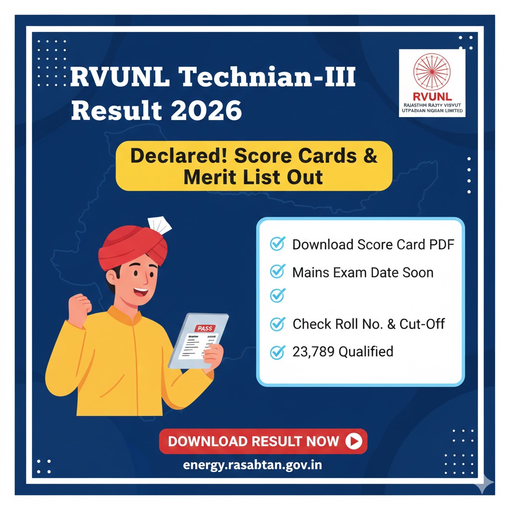 Congratulations to all the candidates who appeared for the RVUNL Technician exams! The Rajasthan Rajya Vidyut Utpadan Nigam Limited (RVUNL) has officially released the Technician-III, Operator-III, and Plant Attendant-III (ITI) Preliminary Results and Score Cards on January 16, 2026.